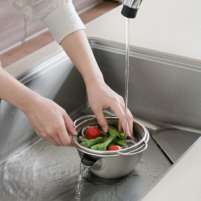 小回りの効く15サイズでお米を研ぐ場合の適量は1〜2合。麺類も1〜2人分がちょうど良いです。他にも豆腐の水切り、野菜の洗浄、冷凍しておいた食品を流水で解凍したい時などにも使いやすいサイズ。注ぐ口が付いたボウルはたこ焼きやホットケーキなどの生地を器具に流し入れやすく、だし巻き卵を作る時も大きすぎて持て余す・・・なんてことがありません。一人暮らしの方やキッチンが狭い方にも快適にお使いいただけるサイズです。
