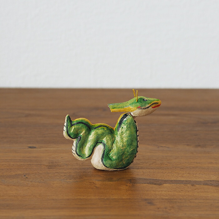 十二支の中で5番目に数えられる縁起の良い架空の生き物、辰。水引であしらわれた角と金色の輝く鱗、天空を見上げる顔、くねくねと曲がりくねった尾、そして勇ましい表情で描かれることが多い辰をユルさを感じさせる愛嬌のある表情に仕上げています。手のひらサイズの小ささですので、好きな場所に気軽に飾ることができるのも現代のライフスタイルにマッチしているおすすめポイント。また、お正月飾りと違って小さくて味わいのある首振り張子の置物なら一年中飾っておくこともできます。