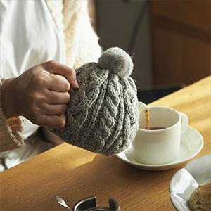 まるでティーポットにかぶせるニット帽のような可愛らしいケーブル編みのティーコージー。ティーコージーはアフターヌーンティーなどのティータイムを大切にするイギリス生まれのアイテムで、ティーポットの保温カバーとして紅茶の温かさを長くキープするために使うものです。