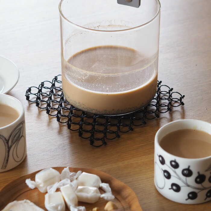 繊細な見た目ながら想像以上に丈夫なため、これなら重たい鋳物鍋を置いても安心。ワイヤーの網目からは熱が逃げやすく、必要以上に熱をため込まないのも普段使いしやすいポイントです。また、ワイヤーの処理がとても丁寧で端が内側に織り込まれているため、引っ掛かりがなくテーブルに傷がつくこともありません。