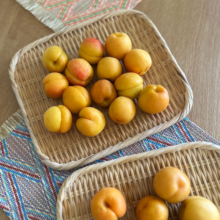 ここ数年、酷暑にやられた杏の木は花も少なく、実も少なく、鳥や虫に食べてもらってました。ところが今年は何年振りでしょう「豊作」の年。実っても食べるつもりはなかったのですが、収穫しなければならないくらい実りました。ジャムおばさんの友人曰く「半干ししてからジャムにするといい」というアドバイスで、角盆ざる3枚を使って干すことに。熟しても鳥が来ないため不思議に思っていたのですが、ジャムにしたらびっくり「すっぱーーーーい!」レモンがいらないくらい酸っぱかったです。
