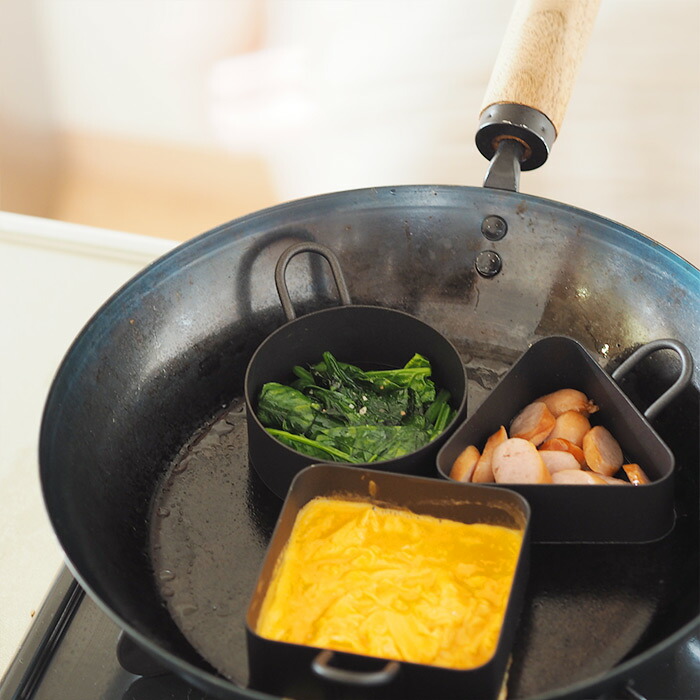 丸・三角・四角の型にフッ素樹脂加工を施した調理リング(別売り商品です)。ひとつのフライパンを仕切ることができ、同時進行で複数のおかずが混ざらず作れる時短アイテムです。忙しい朝食づくりやお弁当のおかずづくり、週末はお子さんと一緒にホットプレートでランチを作ったり。また、味の好みが違う家族のおかず対策にも便利に使えそう。単品で使う場合はお使いのフライパンで、3つ一緒に使う場合は26cm前後のフライパンがおすすめです。