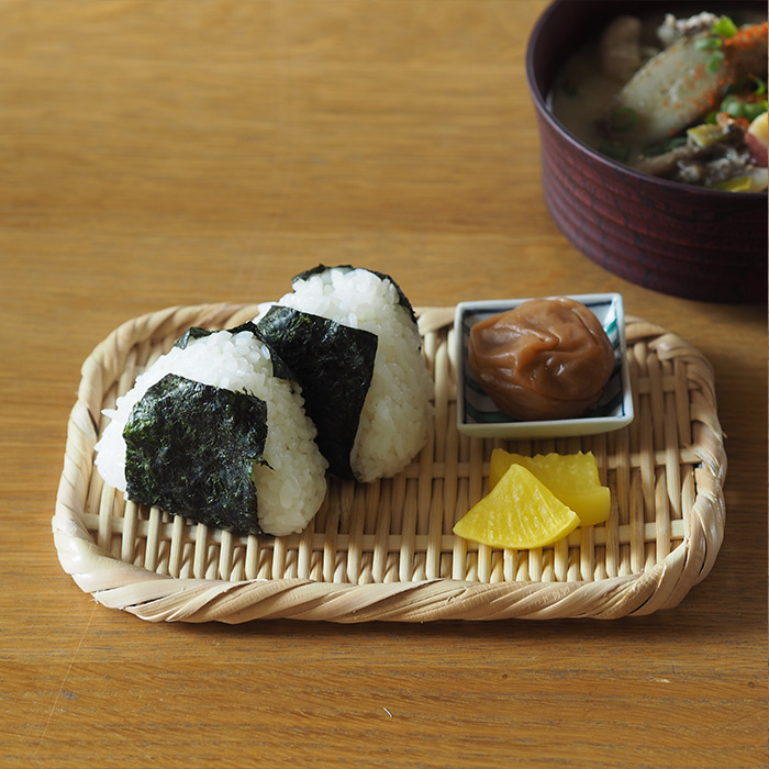 価格がなかなか安定しないお米事情を抱える昨今。そんなご時世だからこそ、お米をもっと美味しく食べたい!と思い、おにぎり定食を作りました。山一のおにぎり型小で作ったミニおにぎりと、たくあんと梅干しをかごやの角盆ざるにのせてあとは豚汁を添えれば、これだけで日本人でよかったと思えます。夏の季節には枝豆をのせてプチ晩酌もいいですね。使い勝手の良い盆ざるです◎