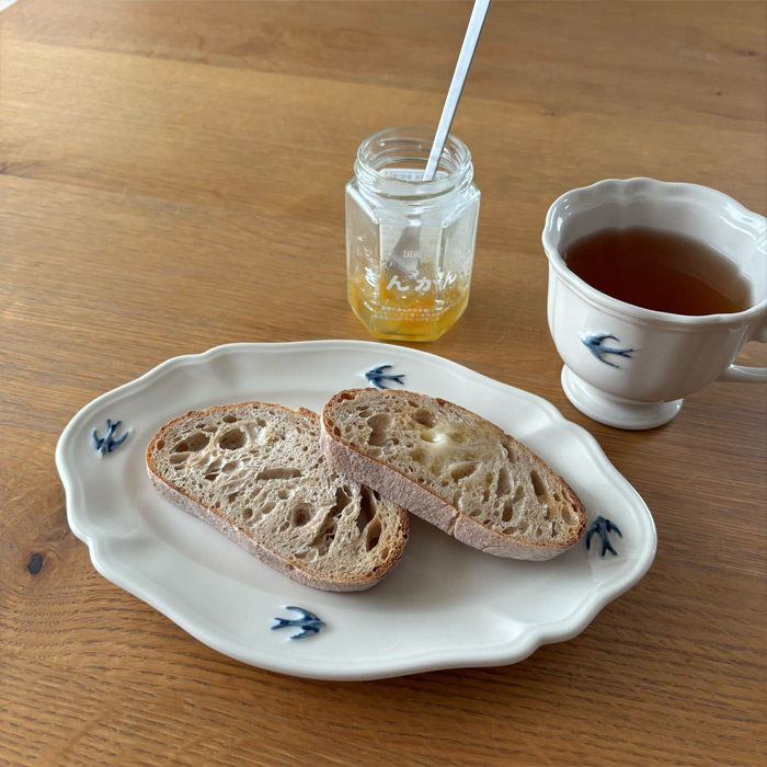 パンと紅茶だけで、可愛いくてほっこり。そんな気持ちにさせてくれるアーリーバードのプレートとマグカップは発売当初から人気のあるアイテムです。金柑ジャムとアールグレイの柑橘系の香りが、暑い夏を少しだけ爽やかな気分にさせてくれます。ジャムをすくう、パンに塗る、終わりかけのジャムも綺麗にとれる、が一本で叶う高桑金属のスプレッダースプーンは、豆板醤やケッパーなどの口が細くて長い瓶詰めの食材をすくう時にもとても便利で、早くも我が家の1軍選手です。