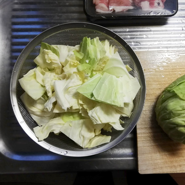 サッと洗ったキャベツをザクザク切ってザルへ。これでキャベツ1/4です。21cmは米研ぎや水切りに便利な万能サイズ。一人暮らしを始めた時に買った安いザルは、針金の処理がイマイチで洗っている時に指に刺さることがあり反省。それから毎日使うものは安心安全なものを選んでいます。丈夫で長く使えるラバーゼは初めての道具選びにもおすすめですよ。