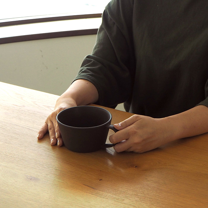 こちらは艶を抑えたマットな仕上がりと浅広の形のsara スープカップです。薄手のカップは口が触れた時のあたりが優しく、スプーンなどで具をすくいやすい広めの口がポイント。ハンドルは大きめに作られているためとても持ちやすいですよ。朝食用のカップスープやかぼちゃのスープ、具だくさんの野菜のスープなど、また冷たいデザート用のカップとして使っても可愛いです。