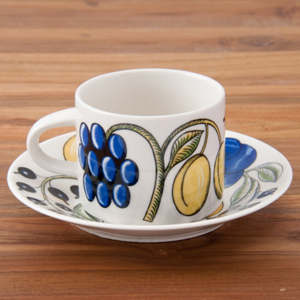 1969年に「フィンランド陶芸界のプリンス」と謳われるビルガー・カイピアイネンのデザインにより製作されました。夏の植物をモチーフにして、青や黄色を多用して描かれた果物と植物のあふれんばかりの力強いエネルギーが、そのままテーブルウェアに落としこまれとても若々しい印象を放ちます。大胆なデザインを独特のタッチで描いています。アイテム毎に少しずつデザインが異なり、豊かな表情を見せてくれるところも魅力的です。何を盛りつけても食材や料理の色を引き立て、テーブルを見事に調和します。まずはメインのプレートから、そして次はマグカップとお気に入りを一つずつ増やしてあなただけの楽園(パラティッシ)をお楽しみください。