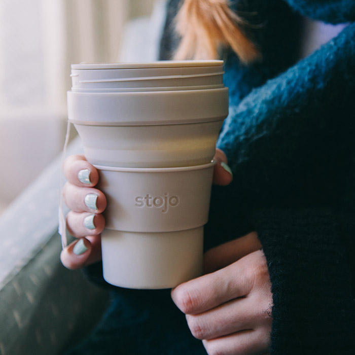 2014年にニューヨークで立ち上げられたブランド、ストージョ(stojo)。これまでなかった画期的なアイデアと環境に優しい素材で作られた繰り返し使える折りたたみ式のマイカップです。ストージョ(stojo)とは、英単語 のstow(場所・容器にしまい込む)と、スラングのJOE(コーヒー)を組み合わせた造語。 その名のとおり、コーヒーを飲んだ後にスリーブを外してカップをクシュっと口元部分に押し込めば、バッグに入れて持ち運べます。