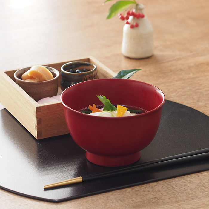 早いもので今年も残り僅か。もうすぐお正月ですね。わが家では、漆琳堂さんの4.5寸の大きい方の汁椀を愛用しています。味噌汁好きの家族には、毎食たっぷりよそえるこのサイズがちょうど良く、お正月のお雑煮も普段使いのこちらのお椀を使います。お餅を二つ入れても美しく盛り付けられ、羽反りの形のおかげで口当たりもとても良いんです。さらに在宅勤務のときの一人ランチには、小丼代わりにもなる万能さ。お正月の特別なお雑煮にも、毎日の食卓にも寄り添ってくれる、頼れる一椀です。