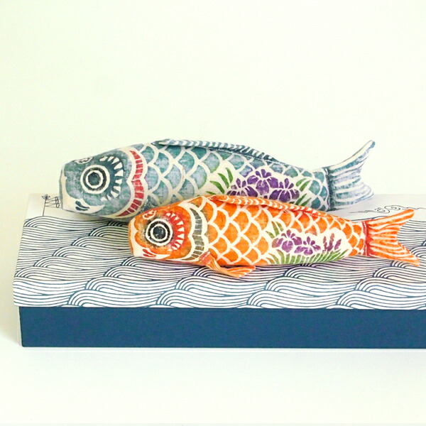 木版手染めぬいぐるみシリーズの鯉のぼりセットです。 箱を開けるとお父さんマゴイと子供のヒゴイが仲良く並んで入っています。 ディスプレイ台としても使える可愛い箱には「鯉のぼり」の歌詞同様、甍(いらか)の波と雲の波、重なる波の中空(なかぞら)が描かれ、鯉のぼりのお腹の部分にも甍の波がさりげなくデザインされています。また、節句を祝う菖蒲の花がステキなアクセントになっていますよ。 淡い色合いで描かれる鯉のぼりの模様一つ一つに意匠を凝らしてあり、贈り物としても喜ばれるはず。5月5日の端午の節句には、日本に伝わる良き風習をご自宅で楽しまれてくださいね。