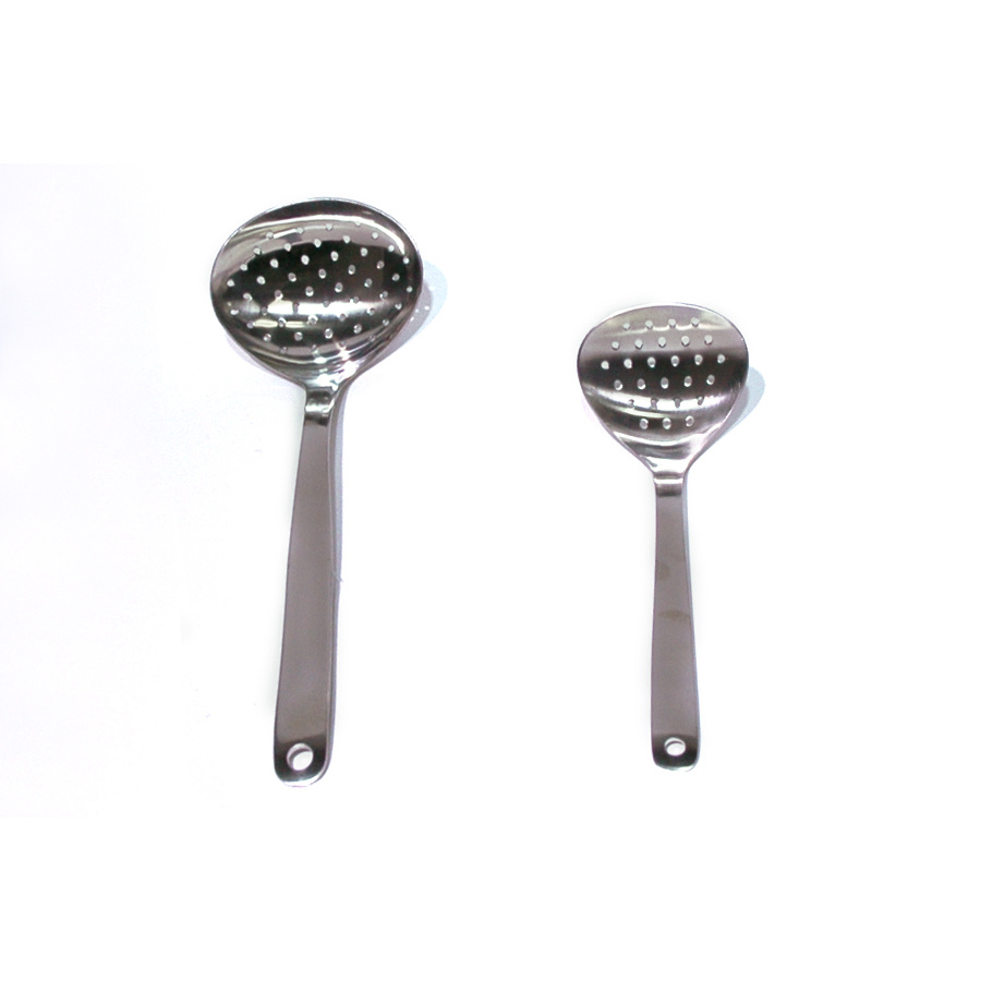 小振りの穴あきお玉です。水炊きなどのお鍋の時や、ゆで卵をお鍋から取り出す時に便利そう。和え物やマリネなどを取り分ける時にもオススメですよ。継ぎ目のないオールステンレス製はお手入れがしやすく衛生的!長くお使いいただけます。