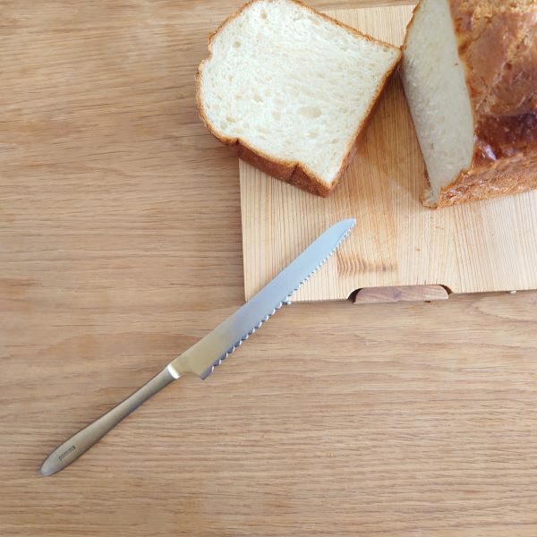 Pommeシリーズのパン切りナイフは、ヴィンテージ感のあるデザインで食卓をおしゃれに演出します。落ち着いた金色の光沢とシンプルなフォルムは、どんな食器にもよく馴染み、特別な日だけでなく日常使いにも最適です。また、パンを切るには十分な長さの、通常より少し短めのサイズ感も魅力。家庭で扱いやすく、長いナイフが苦手な私にはぴったりのサイズでした。小回りが利き、軽くて切れ味も良好です。デザイン性と実用性を兼ね備え、日々の食事を少し特別にしてくれる道具です。