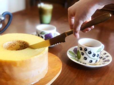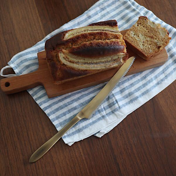 子どもたちが大好きなバナナケーキ。最近は少しでも体にいいものをと思って、グルテンフリーのお菓子作りをすることが多く、このバナナケーキも米粉と黒糖で作りました。 米粉だと割と生地がもっちりしているのですが、このナイフならスッと切れるのでべたついたりポロポロ崩れたりすることもなくきれいに切り分けられます。 見た目が地味になりがちな手作りケーキも、このアンティーク風のナイフで切り分けると素敵にテーブルコーディネートできますよ。