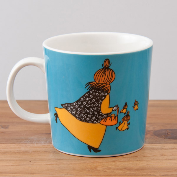 きれいなターコイズブルーにおかあちゃん感あふれるミムラ夫人の笑顔。大好きなマグです。後ろのイラストは、走る子供たちを追いかける夫人の姿。ちょっと待って~と声が聞こえてきそうで、これには共感しかない。今さらながらよく見たら、夫人のマフラーがキツネのような動物!細かい書き込み、見逃していました。