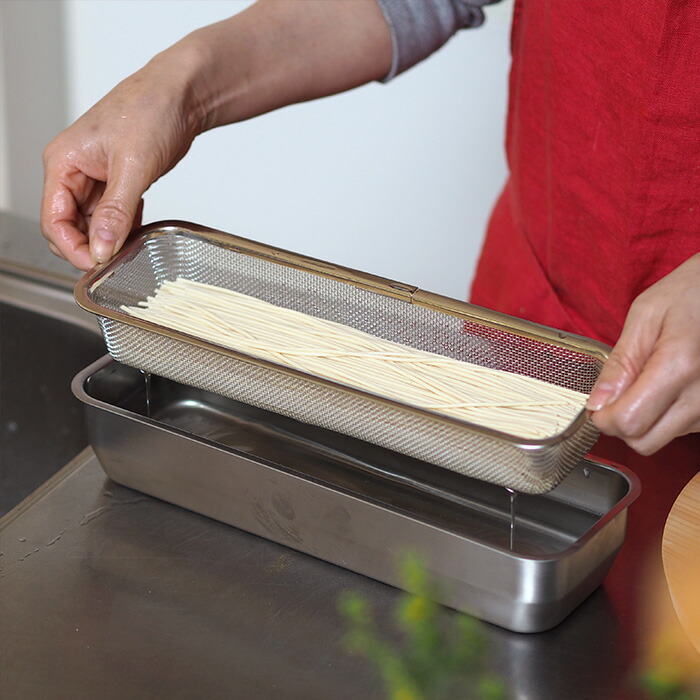 下ごしらえ角ザル1/2ロングは省スペースで作業ができるスリムタイプ。蕎麦やパスタの一時保存、システムトレーを下に敷いて使うと野菜の水切りなどをしたいときにも周りが汚れず快適。またシステムバット1/2ロングと合わせて使えば、水浸けパスタに丁度よいサイズとしてお使いいただけます。水切りが簡単でシンクの上でも衛生的に使える脚付きです。