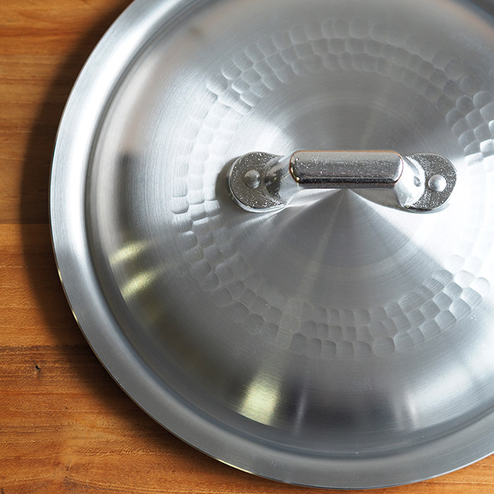 中尾アルミ製作所の打出浅鍋(揚鍋)21cmと一緒にお使いいただける専用の蓋です。軽くて取り回しのしやすいアルミ製ですので、洗い物をするときにも楽チンです。調理中はもちろん、火からおろした後も全体的に熱を帯びていますので、十分に熱が冷めてから蓋に触るか、ミトンや鍋つかみをご使用ください。