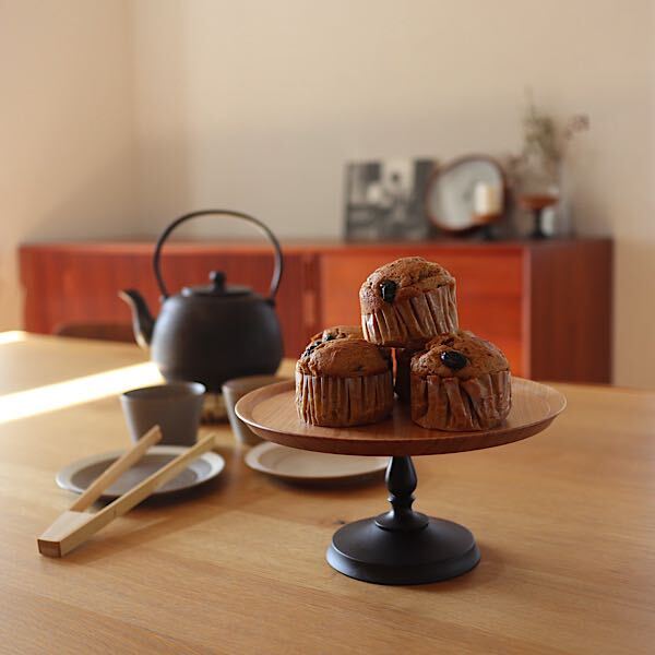 先日、出張で行った丹波篠山で黒豆を買ったのでお正月にたくさん黒豆を作りました。おいしい!と家族にも大好評。でもさすがにお正月を過ぎると飽きてしまってなかなか減らず・・そこで、黒豆を使って黒豆きな粉マフィンを作りました。和の素材を使ったマフィンなので黒染めのコンポートに載せてみました。黒豆茶も入れて和風アフタヌーンティーっぽくコーディネート。シックな雰囲気が和の素材にも合いますよ。