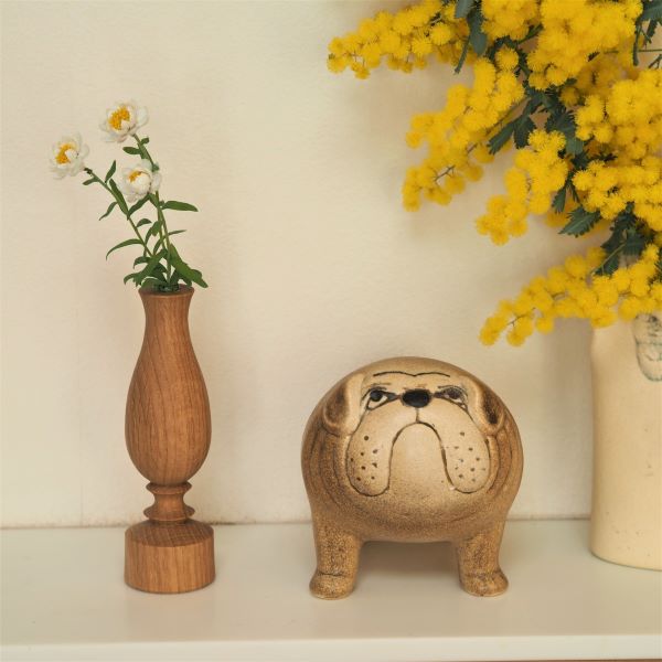 陶器やガラスの花瓶はいくつも持っているけど、木の花瓶って持っていなかったので、発売されるのを楽しみにしてました。春になると花かんざしのポットを買ってくるので、早速挿してみました。1本でも3本でもかわいい!別名が「冬の妖精」という花かんざし。ドライにしてもかわいいままなので、お水を入れなくてもいいですね。リサラーソンのブルドッグと花瓶と一緒に飾ってます。小さいスペースにも置けるし、食卓にもかわいいくて、全種類揃えたいなーって思ってます。