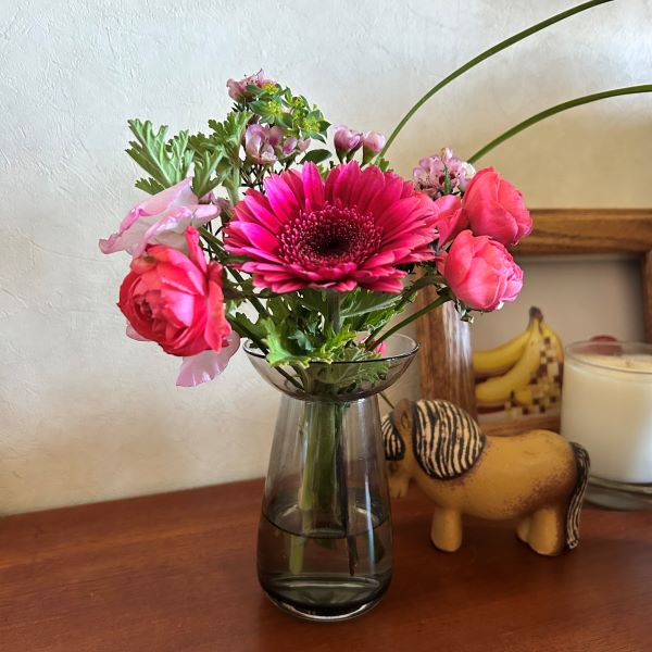 先日、娘が中学校を卒業しました。卒業式にはお友達同士で花束を渡しあったようで、娘が持ち帰ってきたのは大好きなピンク色のミニブーケ。ミニとはいえお花にボリュームがあったため、キントーのアクアカルチャーベースに生けました。上皿の穴に花を挿し、茎の部分を広げるようにするとバランス良く収まります。それにしてもあっという間だったな、中学。この春、卒業式を迎える皆さん、おめでとうございます。