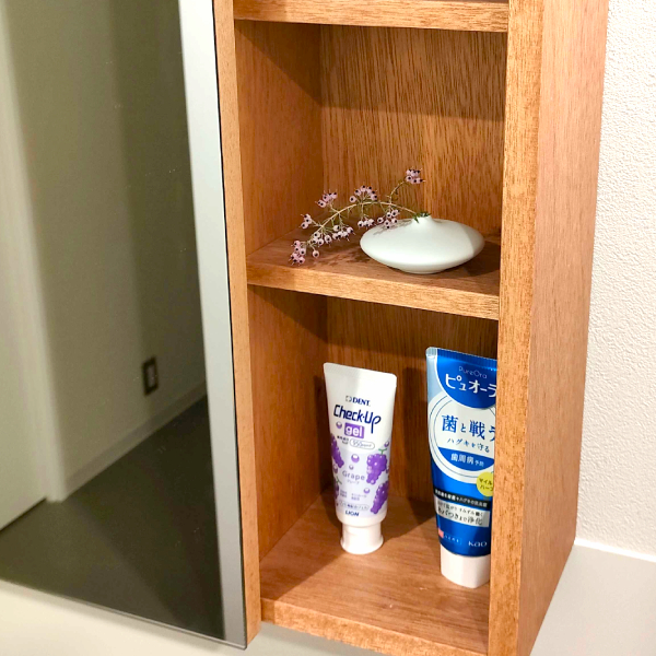 しつらいの扁は高さが3cmしかありません。なのでこんな洗面所の棚でも置けちゃいます。そもそも長く持たせるための花瓶ではないので、終わりかけの花を短く切って楽しむのにも向いているな、と思います。とっても平たいのですが、枝垂れるタイプの花も似合います。