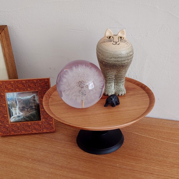 リビングの棚の上に癒しスポットとしてお気に入りのアイテムを並べています。文字通りただ並べていただけだったのでもうちょっとかわいく飾りたいなと思いついたのが、オシオクラフトのコンポート皿。スタンドが墨で染められていることで、プレート部分と同じ色味の棚に載せても同化せず存在感が引き立ちます。アクセサリースタンドやドライフラワーを飾ってもよさそう。妄想が膨らみます。